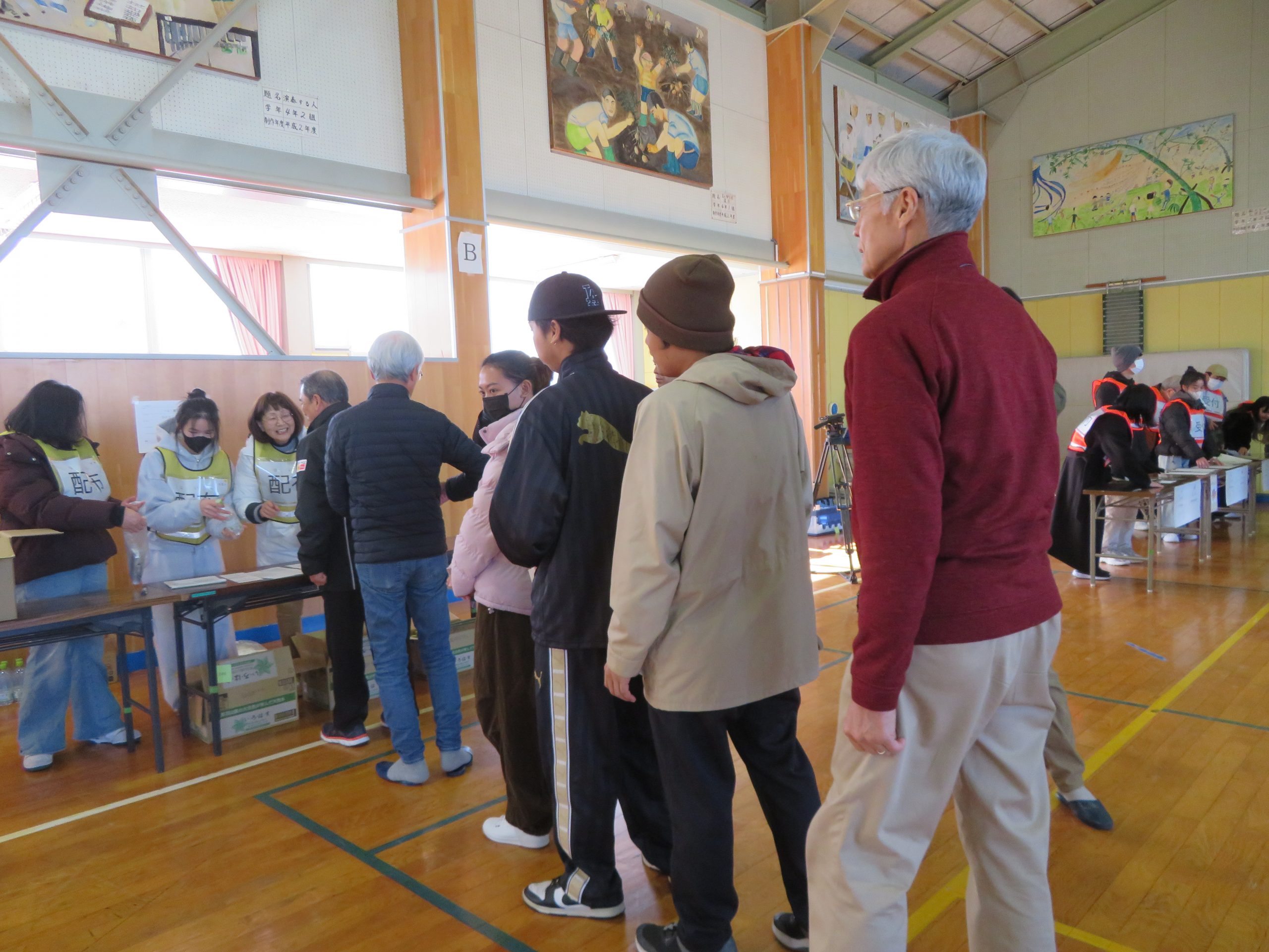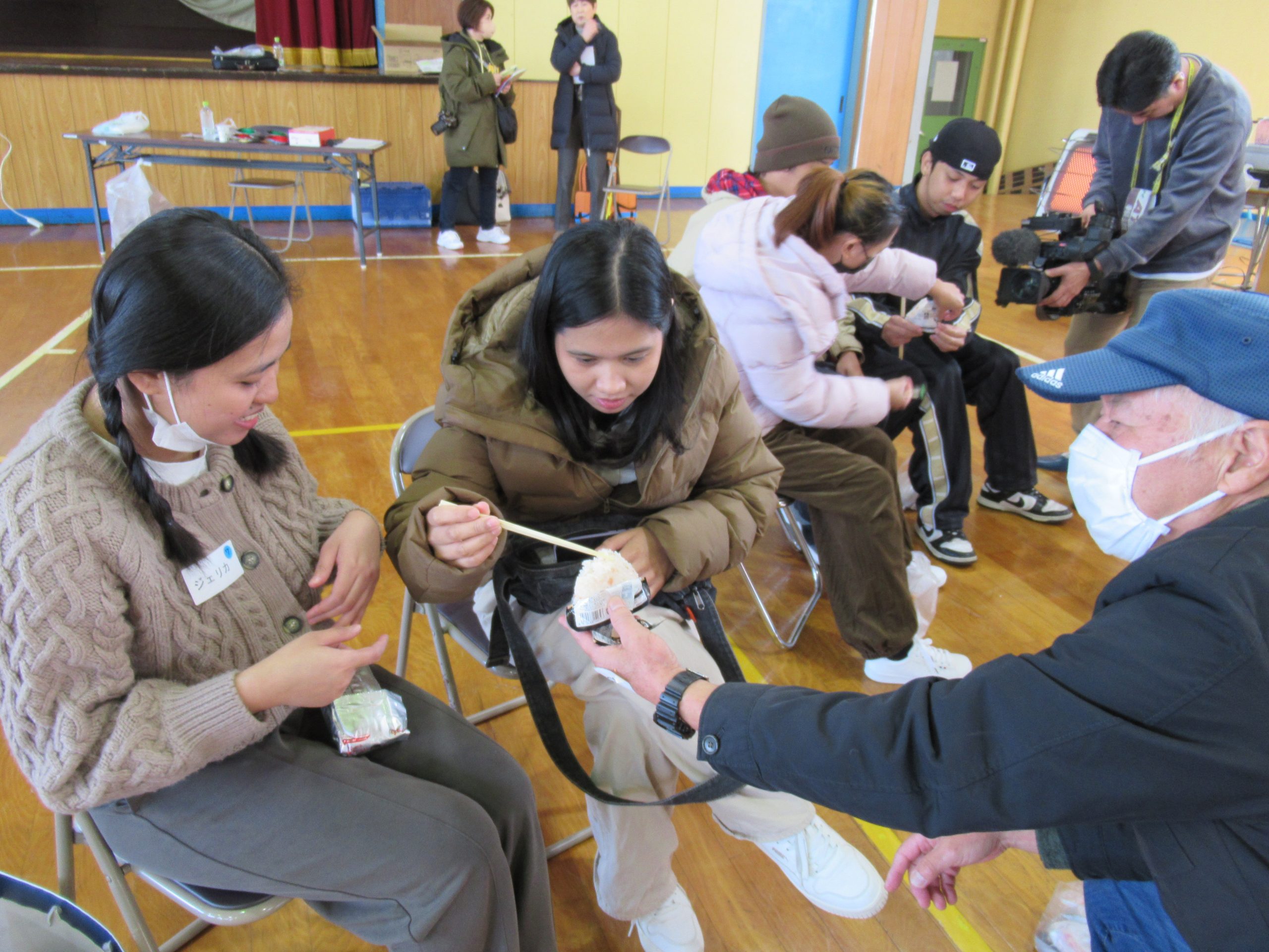 配布訓練では、外国人2名と日本人2名が運営側となり、避難者に非常食や水を配布しました。また、グループの日本人が外国人に、携帯おにぎりの作り方を「やさしい日本語」で説明し、実際に1つ作って試食もしました。