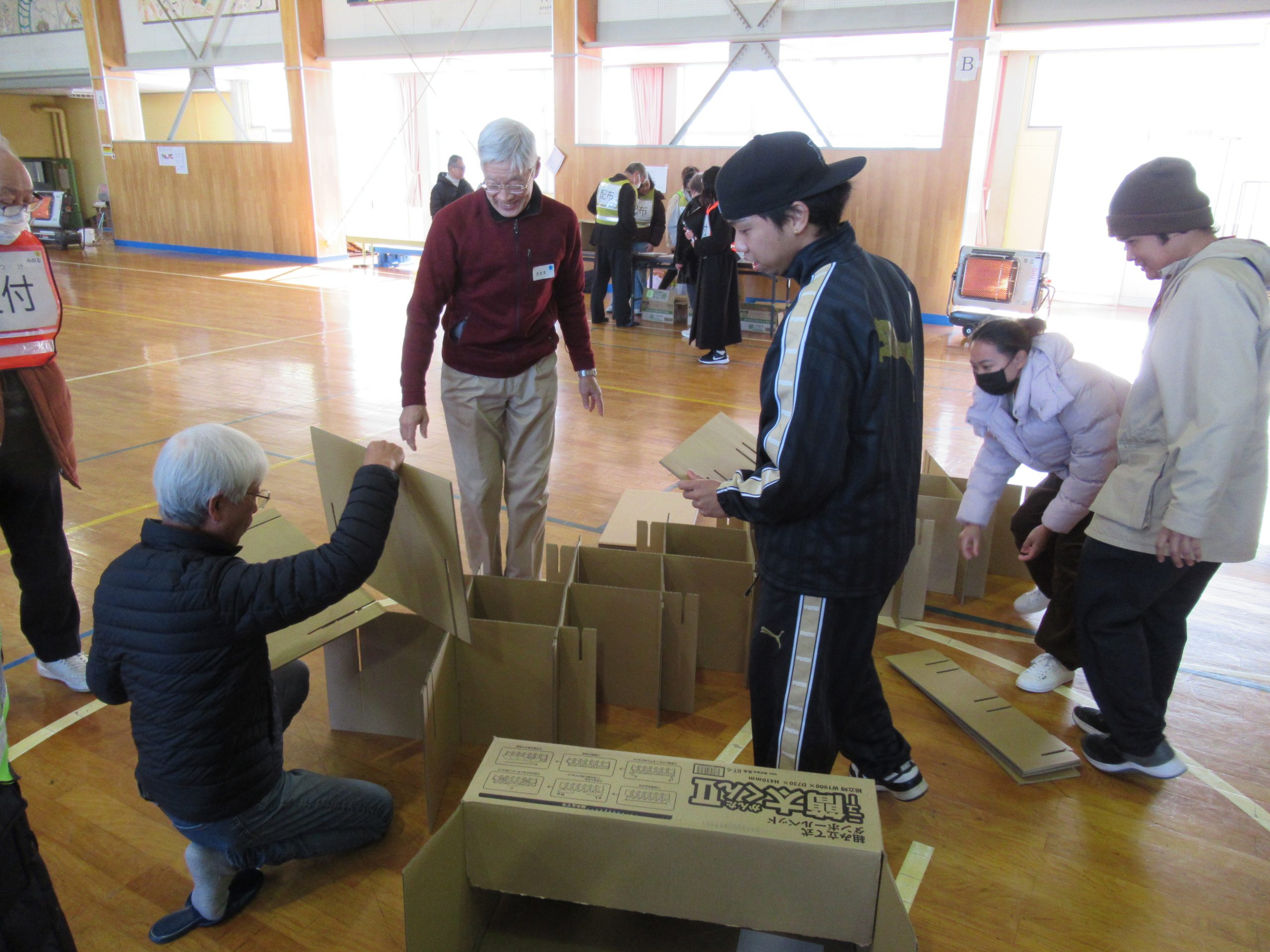 組立訓練では、グループごとに段ボールベッドやトイレ、ワンタッチパーテーション等を組み立てました。グループで協力し合いながらの作業だったので、自然と会話が弾み、交流の機会を生むことが出来ました。