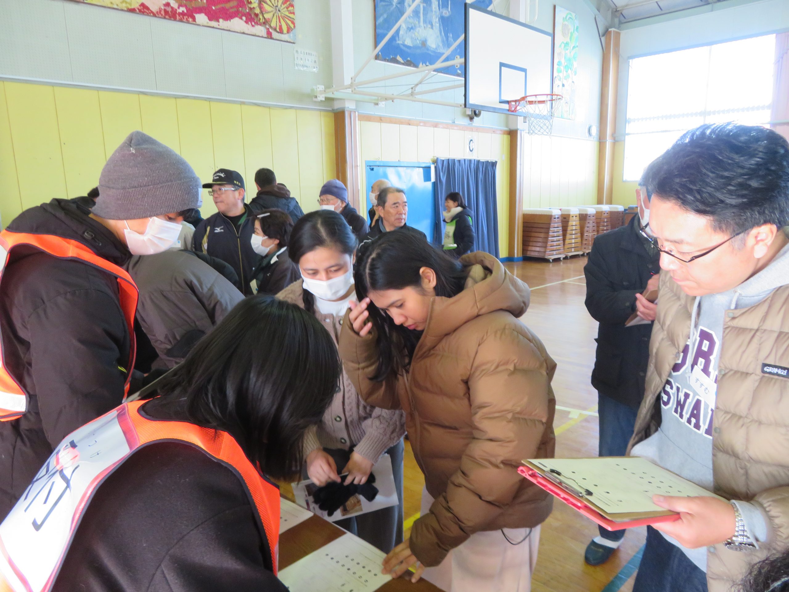 受付訓練では、日本人が「やさしい日本語」で避難者の情報を聞き取り、どうしても伝わらない時には、外国人が通訳サポートを行いました。